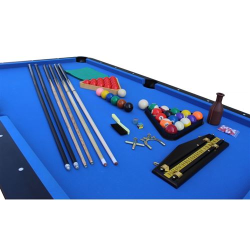 | Accessoires fournis | 2 queues de billard, 2 queues pour snooker, 2 bridge stick, 1 housse de protection intégrale, 1 sachet de billes rouges et blanches, 1 set de boules américain, 1 set de boules snooker, 1 brosse, 1 bouteille pour le bottle pool, 1 triangle en bois, 1 triangle en plastique, 1 compteur de points, 2 craies, 1 rack de rangement |