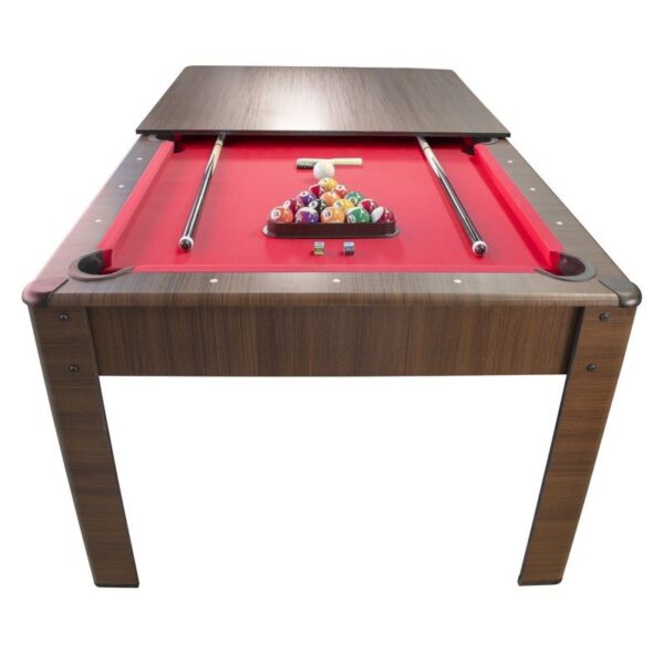 Cette table de Billard peut se convertir en table à manger ou en bureau, grâce au plateau (en 2 parties) inclus et peut accueillir confortablement 6 personnes.
